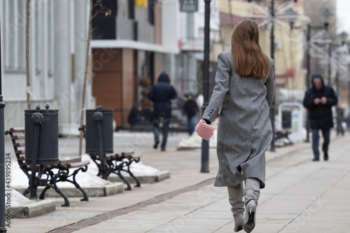 © K64End, Naklejka premium A girl with long straight brown hair, fashionably dressed in a gray coat and gray leather boots, walking away from the camera along the avenue or alley. A teenager walks around the city. Copyspace.