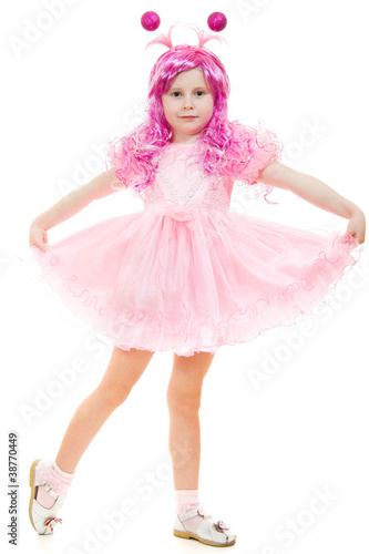 Naklejka premium A girl with pink hair in a pink dress dancing