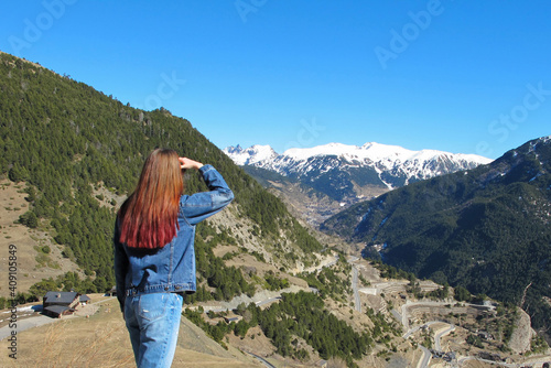 © DiandraNina, Naklejka premium A girl with red hair looks at the mountain's landscape against the bright blue sky. Travel content