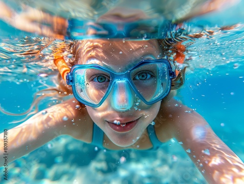 Naklejka premium A girl, woman swimming and smiling underwater, swimming pool, ocean with diving goggles