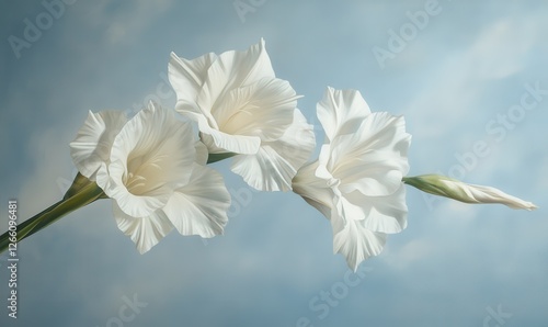 © Valentyna, Fototapeta premium A gladiolus flower in white, contrasted with a pale blue backdrop.
