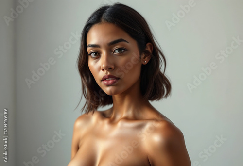 © shehroz khan, Obraz premium A glamorous brunette model with perfect skin and smoky eyes smiles in a studio while showcasing her healthy hair and flawless makeup