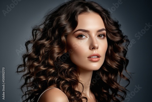 © Ayahe Stock, Fototapeta premium A glamorous brunette woman with long curly hair and beautiful makeup looking confidently in a studio setting