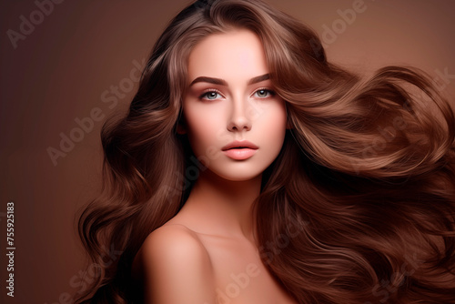 Fototapeta premium A glamorous portrait of a woman with voluminous wavy hair and a soft...