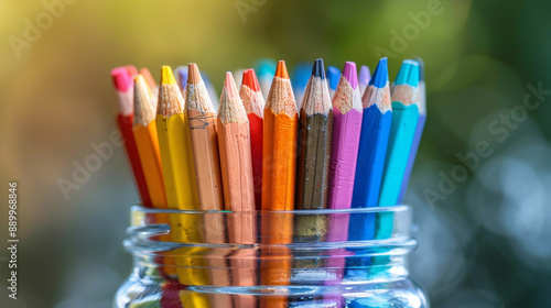 Fototapeta premium A glass jar filled with a rainbow of colored pencils, perfect for art...