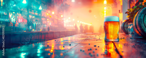 Obraz premium A glass of beer sits on a bar counter in a dimly lit bar