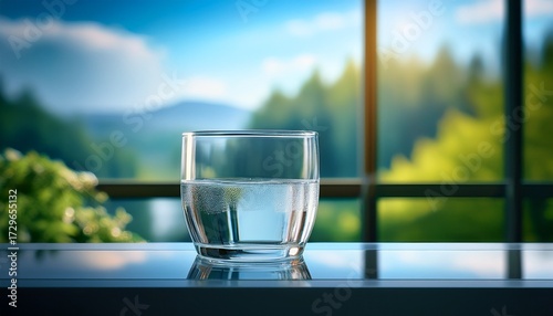 © Trae, Obraz premium A Glass Of Water On Glass Table With Blurred Background