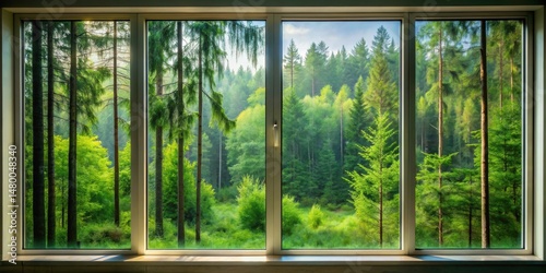 © Kitiphong, Naklejka premium A glass window with a faint image of a forest reflected in it, with trees and foliage outside the pane, as if trapped behind the transparent barrier, solitude, introspection