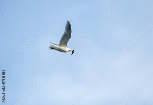 Fototapeta premium A Glaucous-winged Gull in flight, carrying a fish