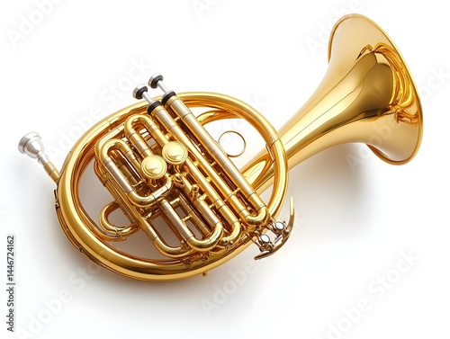Fototapeta premium A gleaming gold French horn rests on a pristine white background showcasing...