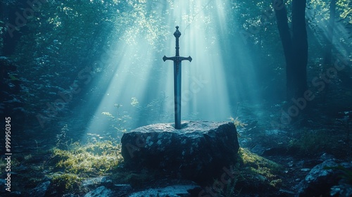 Naklejka premium A gleaming sword stands tall in the heart of a misty forest, bathed in the...