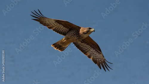 Fototapeta premium A gliding hawk with its wings wide open on a clear blue background