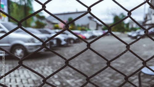 Fototapeta premium A Glimpse Beyond the Fence, Cars Parked in an Urban Landscape