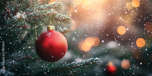 © Init, Obraz premium A glistening red ornament hangs on a snow-dusted Christmas tree, creating a magical winter scene.