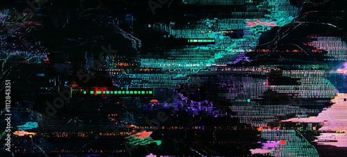 © Katsiaryna, Obraz premium A glitchy pixelated dark background with neon color splashes and glitched-out lines of code