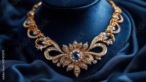 © MrsNoopin, Fototapeta premium A glittering gold necklace with a diamond centerpiece on velvet