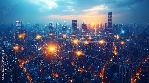 Fototapeta premium A global cityscape seen from above, with illuminated fiber optic cables...