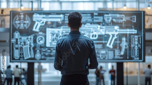 © Dmitry, Fototapeta premium A global conference on firearm technology draws a focused audience, all eyes on the large screen displaying complex machine gun designs.
