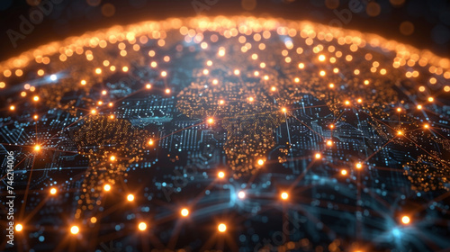 Naklejka premium A globe is embedded with circuits and data streams symbolizing the interconnectedness of the global financial market. With every transaction and exchange data is being generated