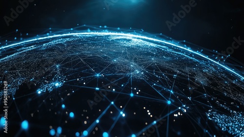 © Matcha_09, Obraz premium A globe with a digital network overlay, representing global internet connectivity, on a dark background