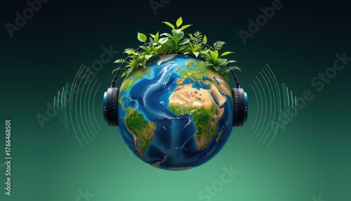 Naklejka premium A globe with headphones, symbolizing harmony between nature and music.