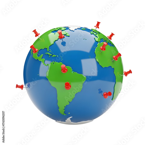 Fototapeta premium A globe with red pushpins marking various locations across continents.