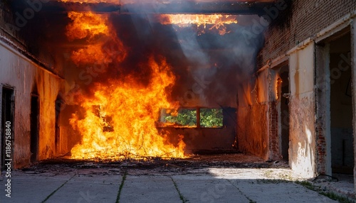 Obraz premium A gloomy scene of a fire breaking out in an abandoned building, flames...