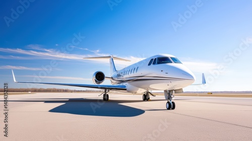 © Preecha, Obraz premium A glossy airplane with panoramic windows on a polished runway, angled shot, copy space on the left, luxurious ad vibe