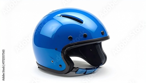 © DeepGrid , Fototapeta premium A glossy blue open-face motorcycle helmet with a clear visor rests upright—its curved form, black trim, and padded interior evoke motion, visibility, and the quiet precision of protective design.