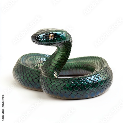 Fototapeta premium A glossy emerald snake, with smooth, coiled scales and a poised stance, captured on a white background.