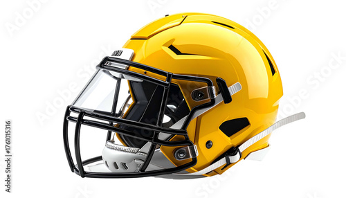 © Sarro, Naklejka premium A glossy, golden American football helmet with a black facemask and visor, isolated on black