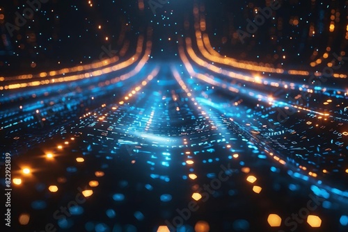 © sunchai, Obraz premium A glowing blue and orange circuit board with a binary code pattern.