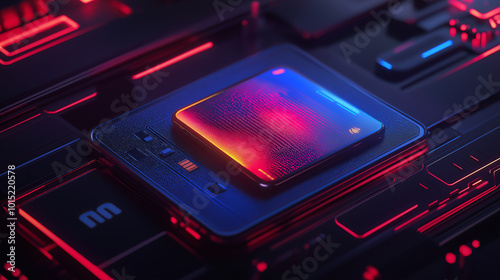 © watz, Obraz premium A glowing blue and red circuit board with a glowing square in the center.
