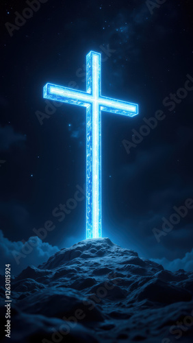 Naklejka premium A glowing blue cross on a hilltop against a starry night sky.