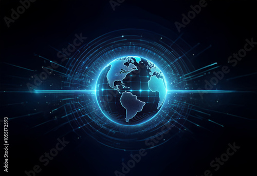Fototapeta premium A glowing blue digital globe in a dark space with concentric circles and a...