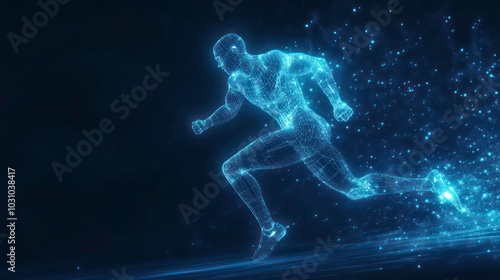 Fototapeta premium A glowing blue digital human figure running on a dark background, composed of lines and dots, representing speed, technology, and the future.