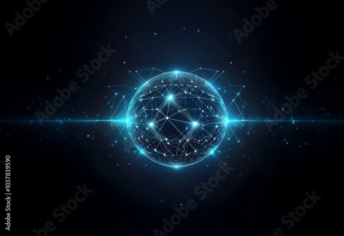Obraz premium A glowing blue sphere composed of connected lines and dots against a dark...