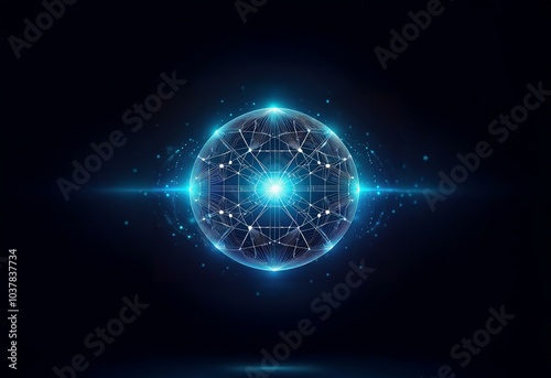 Fototapeta premium A glowing blue sphere composed of interconnected lines and points on a dark...
