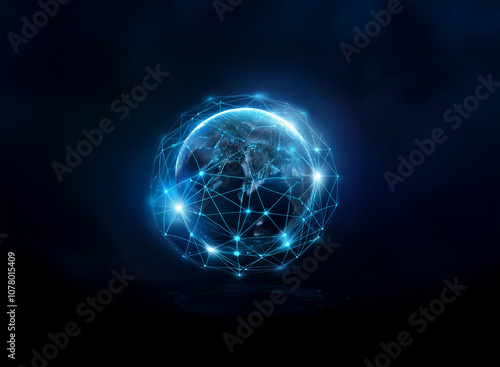 © joeycheung, Obraz premium A glowing blue sphere representing the Earth is surrounded by a network of connected lines and dots.
