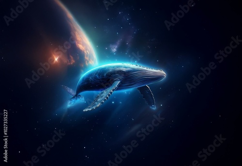 Naklejka premium A glowing blue whale swims through a starry sky near a distant planet.