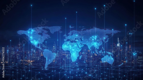 Fototapeta premium A glowing blue world map with lines connecting cities, representing global interconnectedness.