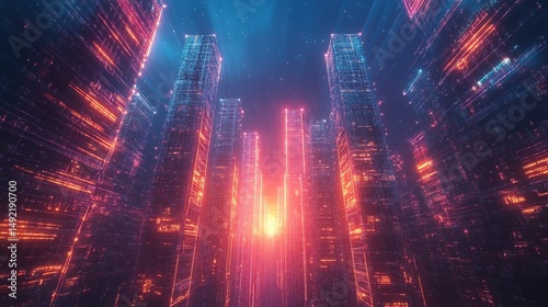 © Dimitri Damir, Fototapeta premium A glowing business skyscraper in the metaverse, representing a digital empire