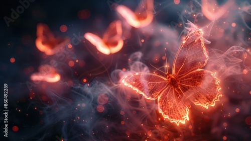 © Oksana, Fototapeta premium A glowing butterfly flies through a haze of smoke and light