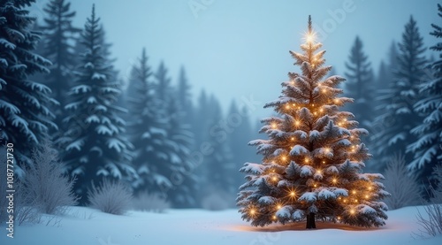 Naklejka premium A glowing Christmas tree covered with snow in a tranquil winter forest under soft evening light