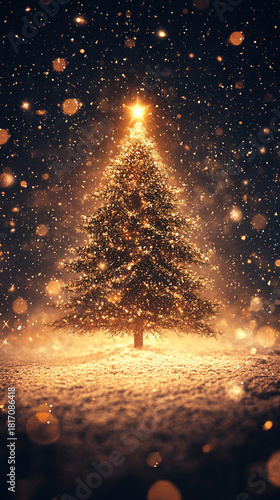 Naklejka premium A glowing Christmas tree rotates softly at the center while snowflakes and...