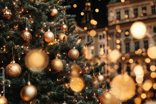 © Lens Legacy, Fototapeta premium A glowing Christmas tree stands adorned with golden baubles, set against a warm and blurred backdrop of European architecture, creating a festive evening atmosphere.