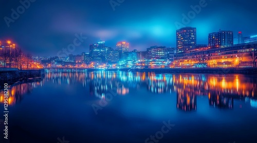 © Nurillo, Fototapeta premium A glowing cityscape at night with reflections in a calm river, leaving room for text. picture