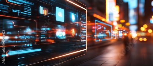 © Moviebirth, Fototapeta premium A glowing cityscape where AI drones project holographic advertisements in a bustling cybermarket