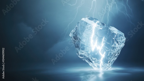Fototapeta premium A glowing, cracked ice heart illuminated by electric blue lightning against a...