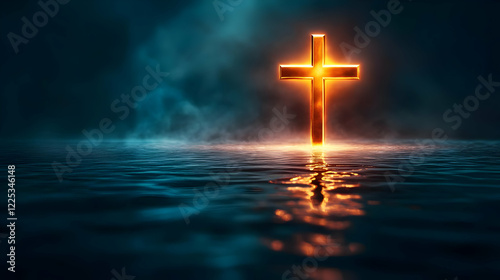 Fototapeta premium A glowing cross illuminated over calm waters, symbolizing faith and hope in a...